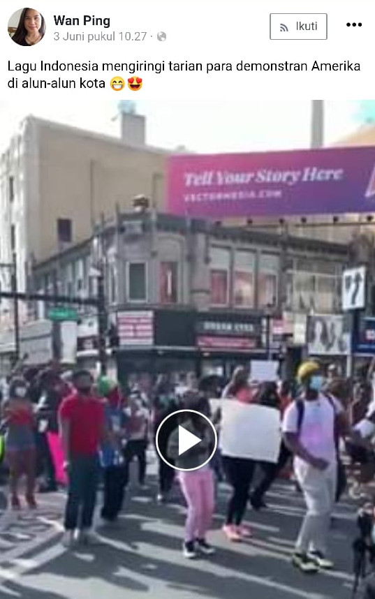 Beredar sebuah video yang memperlihatkan aksi demonstrasi Black Lives Matter di Amerika Serikat. Di tengah aksi, sejumlah pengunjuk rasa menari dengan diiringi lagu Indonesia.